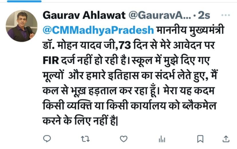 एनआरआई गौरव अहलावत ने सोशल मीडिया पर लिखा, “CM Madhya Pradesh माननीय मुख्यमंत्री डॉ. मोहन यादव जी, 73 दिन से मेरे आवेदन पर FIR दर्ज नहीं हो रही है। स्कूल में मुझे दिए गए मूल्यों और हमारे इतिहास का संदर्भ लेते हुए, मैं कल से भूख हड़ताल कर रहा हूं। मेरा यह कदम किसी व्यक्ति या किसी कार्यालय को ब्लैकमेल करने के लिए नहीं है।”