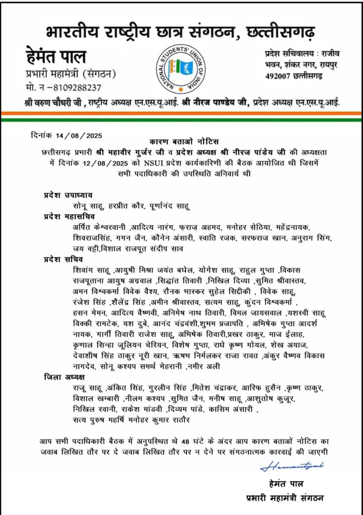 रायपुर। भारतीय राष्ट्रीय छात्र संगठन (NSUI) छत्तीसगढ़ ने 12 अगस्त 2025 को आयोजित प्रदेश कार्यकारिणी की बैठक में शामिल न होने वाले 84 पदाधिकारियों को कारण बताओ नोटिस जारी किया है. यह बैठक प्रदेश प्रभारी महावीर गुर्जर और प्रदेश अध्यक्ष नीरज पांडेय की अध्यक्षता में हुई थी, जिसमें सभी पदाधिकारियों की उपस्थिति अनिवार्य थी. लेकिन कार्यक्रम के दौरान कई प्रदेश उपाध्यक्ष, प्रदेश महासचिव, प्रदेश सचिव और जिला अध्यक्ष बैठक में मौजूद नहीं थे. संगठन ने इसे गंभीरता से लेते हुए सभी अनुपस्थित पदाधिकारियों से 48 घंटे के भीतर लिखित स्पष्टीकरण मांगा है.