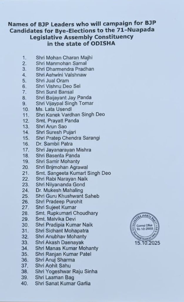 भुवनेश्वर: भारतीय जनता पार्टी (भाजपा) ने आगामी नुआपड़ा विधानसभा उपचुनाव के लिए स्टार प्रचारकों की सूची जारी कर दी है. इस महत्वपूर्ण चुनावी मुकाबले में कुल 40 प्रमुख नेता पार्टी के लिए प्रचार करेंगे. स्टार प्रचारकों की सूची में मुख्यमंत्री मोहन चरण माझी और केंद्रीय शिक्षा मंत्री धर्मेंद्र प्रधान शामिल हैं. पार्टी के लिए प्रचार करने वाले अन्य प्रमुख नेताओं में केंद्रीय रेल मंत्री अश्विनी वैष्णव, केंद्रीय जनजातीय मामलों के मंत्री जुएल ओराम और छत्तीसगढ़ के मुख्यमंत्री विष्णु देव साईं शामिल हैं.