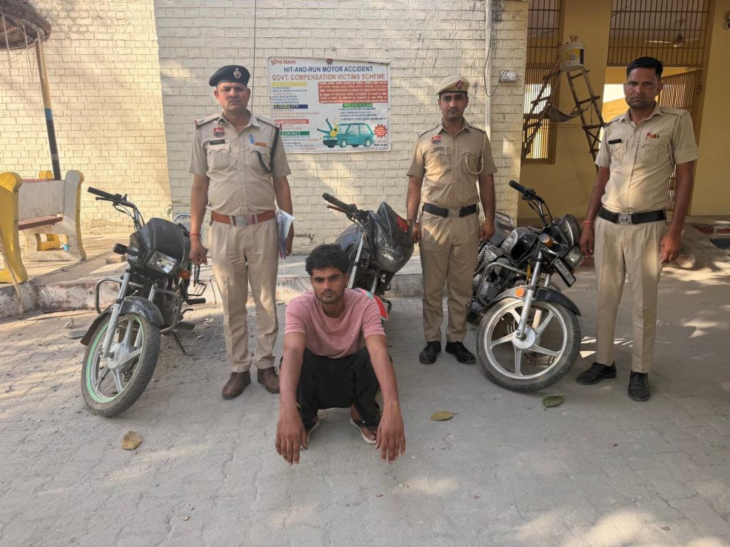 सोनू वर्मा, नूंह। पुन्हाना सदर थाना पुलिस ने वाहन चोरी के मामलों में बड़ी सफलता हासिल करते हुए शातिर बाइक चोर बिलाल पुत्र इब्राहिम निवासी गांव लाहरवाड़ी थाना सदर पुन्हाना को चोरी की मोटरसाइकिल के साथ गिरफ्तार किया है ।