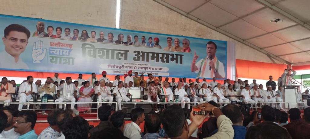बता दें कि कांग्रेस की छत्तीसगढ़ न्याय यात्रा का समापन आज रायपुर के गांधी मैदान में हो रहा है. न्याय यात्रा 27 सितंबर को गिरौदपुरी से शुरू हुई थी जो 125 किलोमीटर की दूरी तय कर गांधी मैदान पहुंची है. समापन कार्यक्रम में एक आमसभा का आयोजन किया गया है, जिसमें छत्तीसगढ़ कांग्रेस प्रभारी सचिन पायलट, पीसीसी चीफ दीपक बैज, पूर्व सीएम भूपेश बघेल, टीएस सिंहदेव, ताम्रध्वज साहू, मोहन मरकाम, धनेंद्र साहू, रवींद्र चौबे, रुद्रगुरु, डॉ. शिवकुमार डहरिया, अमरजीत भगत, फूलोदेवी नेताम, विजय जांगिड़, राजेश तिवारी सहित कई विधायक शामिल हुए हैं.