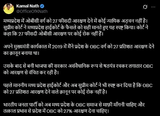 कमलनाथ ने आगे कहा, “उसके बाद से बनी भाजपा की सरकार असंवैधानिक रूप से षड्यंत्र रचकर लगातार OBC को आरक्षण से वंचित कर रही है। पहले माननीय मध्य प्रदेश हाईकोर्ट और अब सुप्रीम कोर्ट ने भी स्पष्ट कर दिया है कि OBC को 27 प्रतिशत आरक्षण देने वाले कानून पर कोई रोक नहीं है।भारतीय जनता पार्टी को अब मध्य प्रदेश के OBC समाज से माफी मांगनी चाहिए और तत्काल प्रभाव से प्रदेश में OBC को 27% आरक्षण देना चाहिए।”