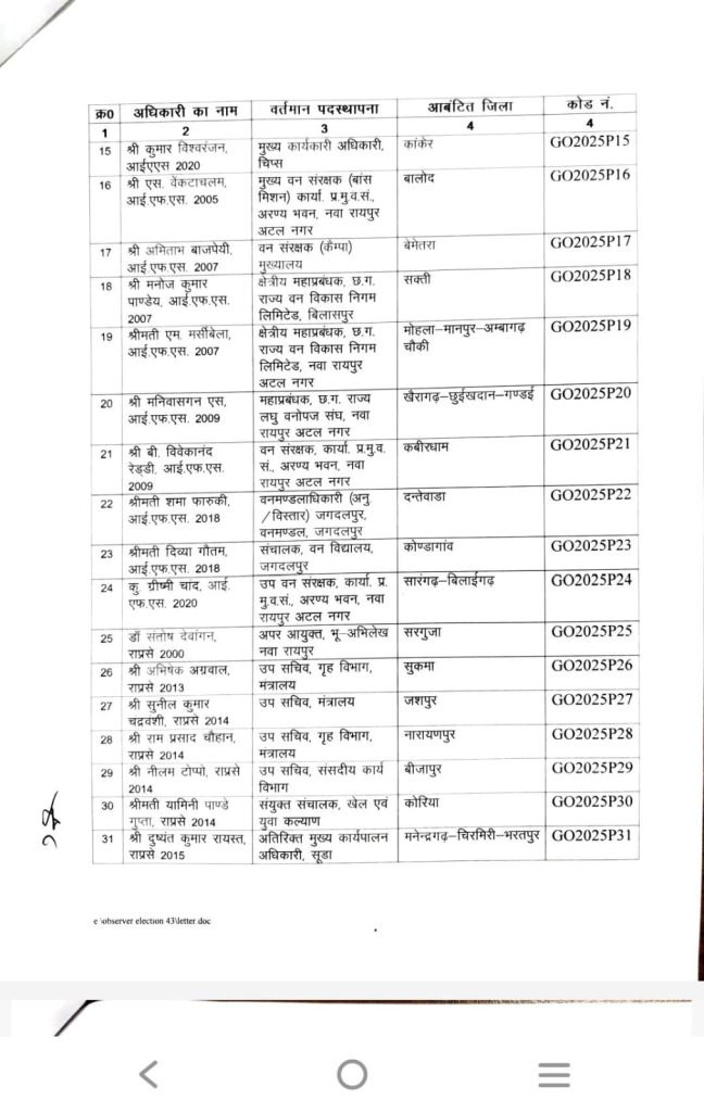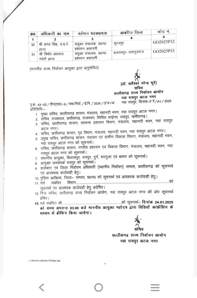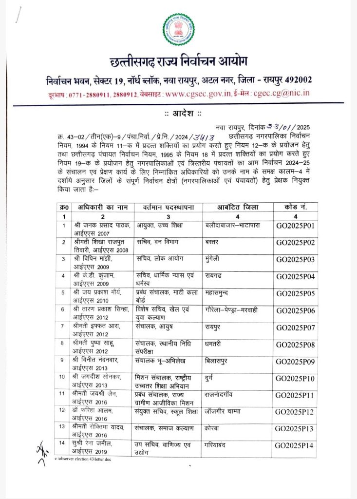 रायपुर। छत्तीसगढ़ में होने वाले नगरीय निकाय और त्रिस्तरीय पंचायत चुनाव के संचालन के लिए राज्य निर्वाचन आयोग ने अलग-अलग जिलों के लिए प्रेक्षकों की नियुक्ति की है.