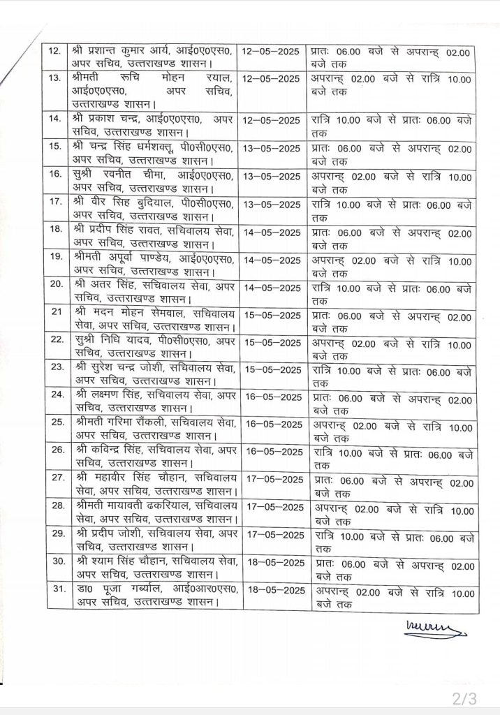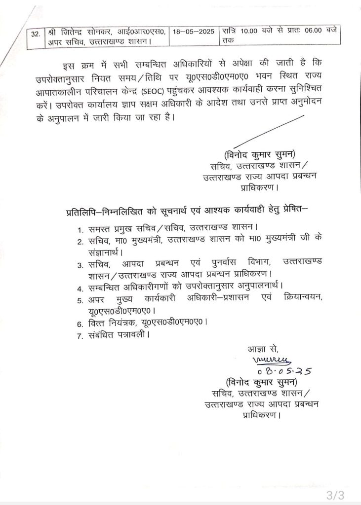 उत्तराखण्ड राज्य आपदा प्रबन्धन प्राधिकरण के सचिव विनोद कुमार सुमन की ओर से जारी आदेश के मुताबिक 32 अधिकारियों की तैनाती की गई है. जो इस प्रकार हैं-