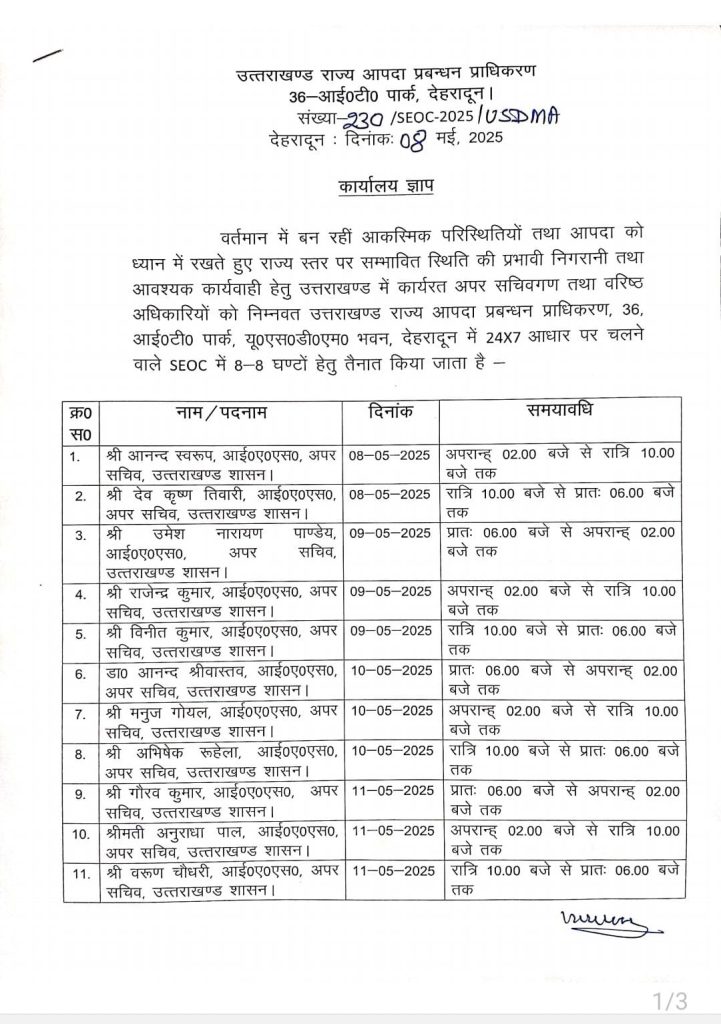 वर्तमान में बन रहीं आकस्मिक परिस्थितियों और आपदा को ध्यान में रखते हुए राज्य स्तर पर सम्भावित स्थिति की प्रभावी निगरानी और आवश्यक कार्रवाई के लिए उत्तराखण्ड में कार्यरत अपर सचिवगण के लिए वरिष्ठ अधिकारियों की तैनाती की गई है. उत्तराखण्ड राज्य आपदा प्रबन्धन प्राधिकरण (USDMA) में 24X7 आधार पर चलने वाले SEOC में 8-8 घण्टों के लिए ये तैनाती की गई है.