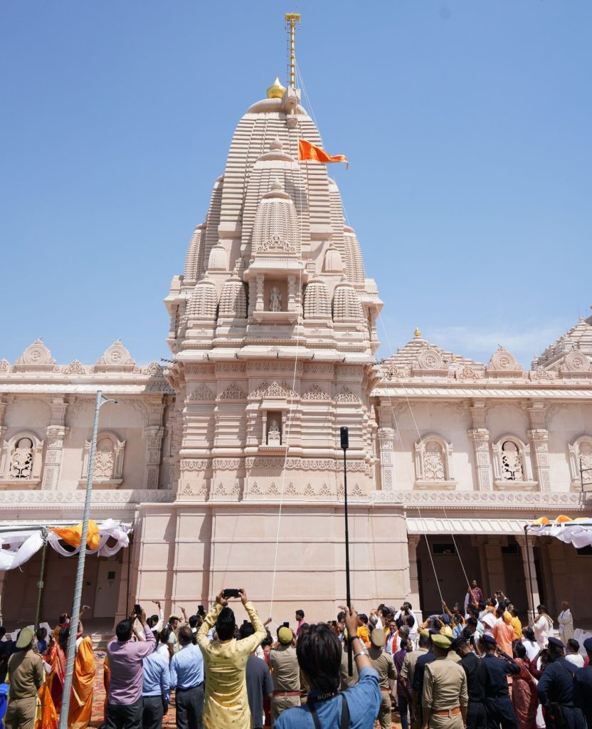 अयोध्या. श्री हनुमान जयंती (Hanuman Jayanti) के अवसर पर गुरुवार को श्रीराम जन्मभूमि मन्दिर में परकोटे के दक्षिणी भुजा के मध्य स्थित श्री हनुमान मंदिर पर ध्वजारोहण किया गया. शिखर पर 19 फिट 7 इंच ऊंचे दंड पर आरोहित ध्वज 9 फिट 3 इंच लंबा और 4 फिट 7 इंच चौड़ा है. वहीं हनुमान जयंती के अवसर पर उद्योगपति गौतम आडानी सपरिवार अयोध्या पहुंचे और श्रीरामलला और श्री हनुमान जी की पूजा-अर्चना की.