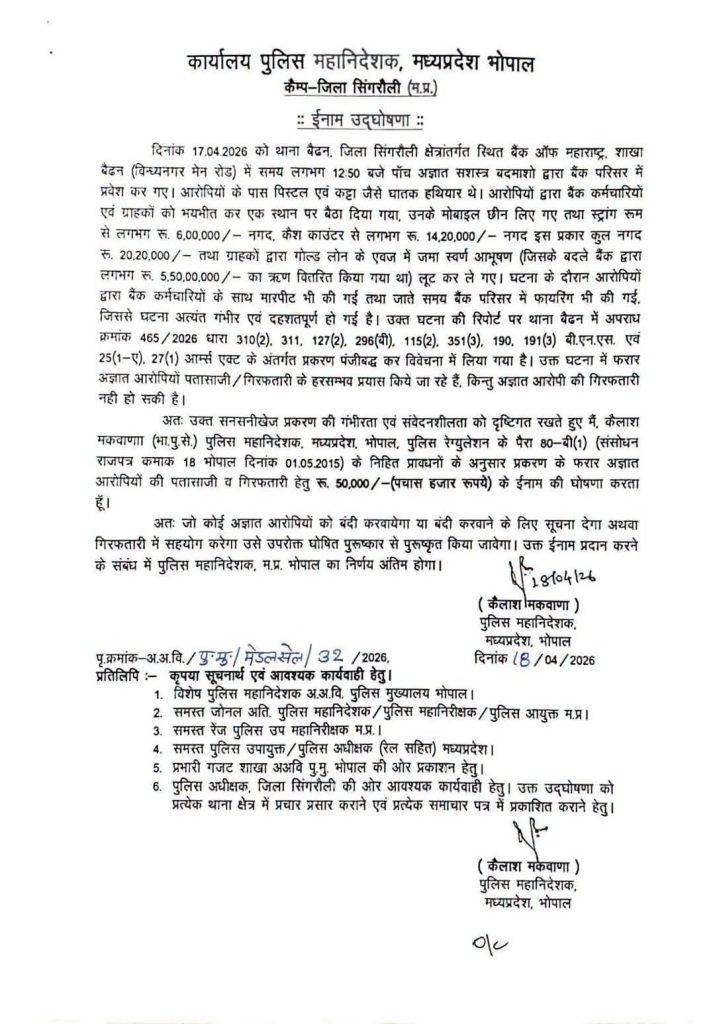 सुरेश कुमार, सिंगरौली। मध्य प्रदेश के सिंगरौली जिले के बैंक ऑफ महाराष्ट्र में हुई दिनदहाड़े डकैती मामले में कार्रवाई तेज कर दी गई है। प्रदेश के डीजीपी कैलाश मकवाना ने आरोपियों की गिरफ्तारी को लेकर 50,000 रुपये का इनाम घोषित किया है। वहीं इस मामले में एक आरोपी को बिहार और दूसरे को महाराष्ट्र के औरंबाद से दबोचा गया है। एमपी पुलिस छत्तीसगढ़ और उत्तर प्रदेश की पुलिस के संपर्क में है। बॉर्डर पर नाकाबंदी कर दी गई है। तीन अन्य आरोपियों की सरगर्मी से तलाश की जा रही है।