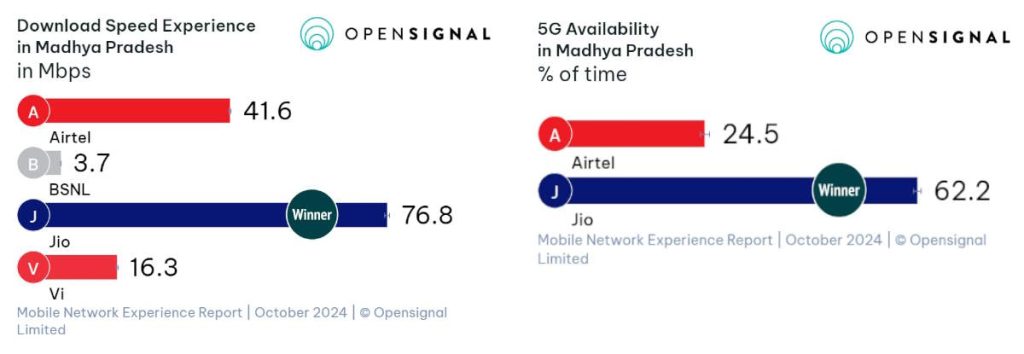 जियो का राष्ट्रीय स्तर पर भी प्रदर्शन मजबूत है, ओपन सिग्नल ने जियो के 5जी कवरेज और सबसे ज्यादा डाउनलोड स्पीड पर मुहर लगाई है. मध्यप्रदेश-छत्तीसगढ़ में जियो प्रमुख श्रेणी 5जी उपलब्धता, समग्र नेटवर्क उपलब्धता के साथ ओवरआल-डाउनलोड स्पीड में पहले स्थान पर है.