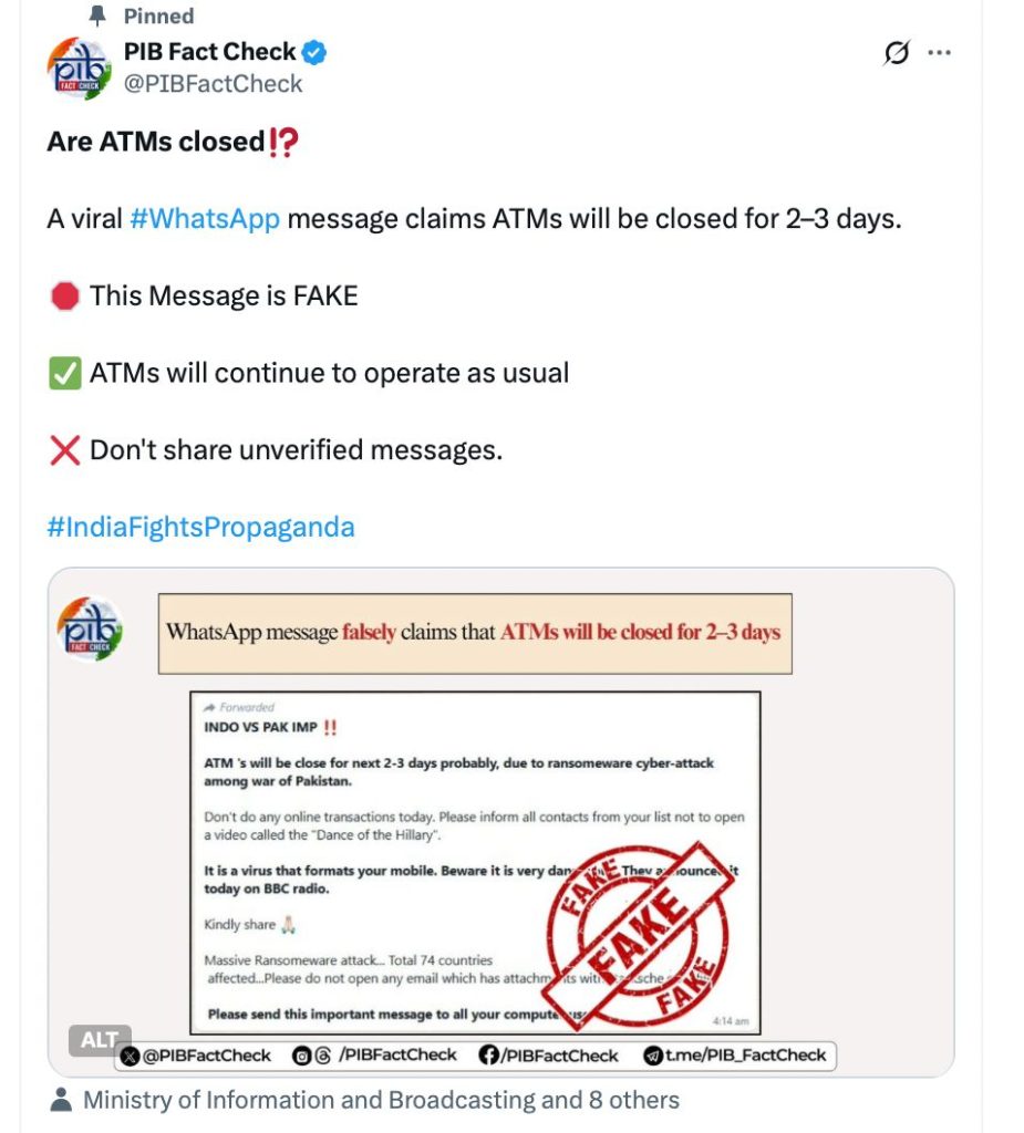 सोशल मीडिया में लगातार पोस्ट किए जा रहे खबरों की सत्यता को परखने के लिए पहले से ही प्रेस इन्फोर्मेशन ब्यूरो (पीआईबी) की टीम लगी हुई है, लेकिन इसमें देशभक्त भारतीय भी जुट गए हैं. पीआईबी ने दो से तीन दिनों के लिए एटीएम बंद रहने वाली खबरों को खारिज करते हुए बताया कि यह खबर झूठी है. एटीएम हमेशा की तरह 24 घंटे, सातों दिन कार्यरत हैं.