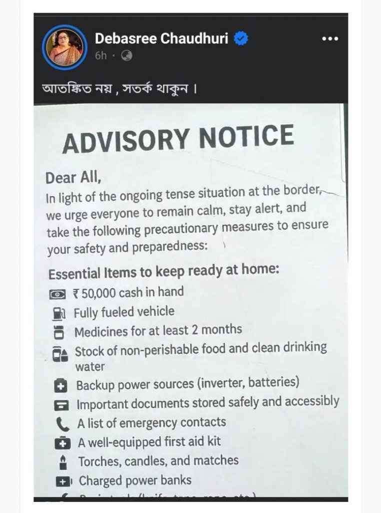 इसी तरह से युद्ध की स्थिति के मद्देनजर फर्जी एडवाइजरी को लेकर भी यूजर ने सतर्क किया है. इसमें घर पर 50 हजार रुपए नगद रखने के साथ गाड़ी में पूरी तरह से फ्यूल भरे होने, दो महीनों के लिए दवाई रखने, साफ पानी को स्टोर करने, बैकअप पावर को पूरी तरह से चार्ज रखने, महत्वपूर्ण दस्तावेजों को सुरक्षित और संभाल कर रखने, इमरजेंसी कॉन्टेक्ट की सूची तैयार रखने, फर्स्ट एड किट तैयार रखने, टॉर्च, मोमबत्ती और माचिस पहुंच की जगह में सुरक्षित रखने की एडवायजरी जारी होने की बात को यूजर देबाश्री चौधरी खारिज करती नजर आ रही है.