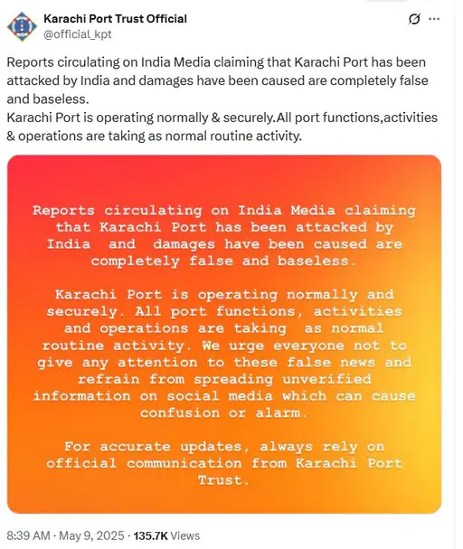 केवल भारत ही नहीं पाकिस्तान के भी संस्थान भी झूठी खबरों की सत्यता बताने में जुटे हुए हैं. कल रात भर भारत के जंगी जहाजों के पाकिस्तान के कराची बंदरगार पर हमला किए जाने की खबर वायरल होती रही. इस पर कराची पोर्ट ट्रस्ट ने बाकायदा सोशल मीडिया में पोस्ट कर बताया कि कराची बंदरगार बंद नहीं है, सामान्य तौर पर आम दिनों की तरह गतिविधियां चल रही है.