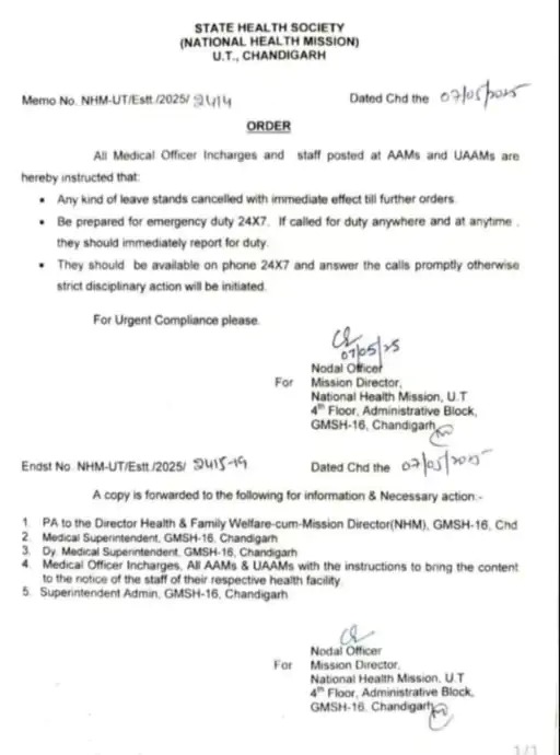 जारी आदेश के अनुसार सभी को निर्देश दिए गए हैं कि आपातकालीन ड्यूटी के लिए तैयार रहना है। चंडीगढ़ यूटी के राष्ट्रीय स्वास्थ्य मिशन के मिशन हेल्थ डायरेक्टर ने कहा, “24/7 आपातकालीन ड्यूटी के लिए तैयार रहें। अगर कहीं भी और कभी भी ड्यूटी के लिए बुलाया जाता है, तो उन्हें तुरंत ड्यूटी पर रिपोर्ट करना चाहिए। उन्हें हर समय उपलब्ध रहना चाहिए और कॉल का तुरंत जवाब देना चाहिए। अन्यथा, सख्त अनुशासनात्मक कार्रवाई शुरू की जाएगी।