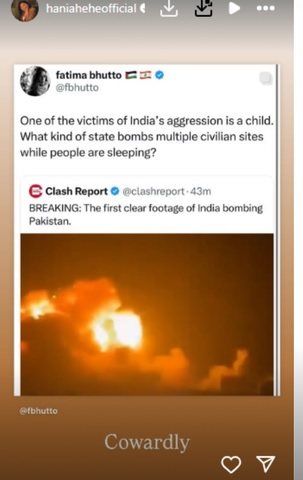 एक्ट्रेस हानिया आमिर (Hania Aamir) ने भी अपनी इंस्टाग्राम स्टोरी पर एक शब्द की पोस्ट के साथ रिएक्शन दिया है. उन्होंने भारत की पाक आतंकी ठिकानों पर की गई कार्रवाई को “कायरतापूर्ण” बताया है.