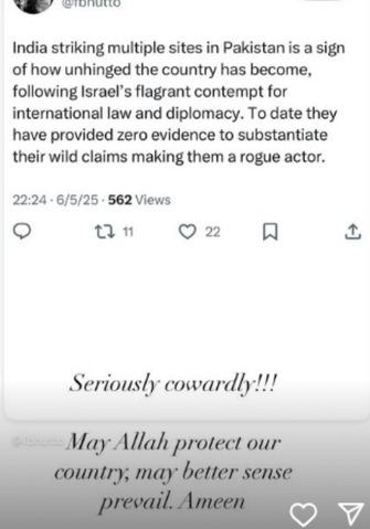पाकिस्तान की मोस्ट पॉपुलर एक्ट्रेस माहिरा खान (Mahira Khan) ने लेखिका फातिमा भुट्टो के ट्वीट को रीपोस्ट किया जिसमें हमलों की आलोचना की गई थी और अपनी इंस्टाग्राम स्टोरी पर लिखा, “सीरियसली कायरतापूर्ण!!! अल्लाह हमारे देश की रक्षा करे, सदबुद्धि आए. आमीन.”