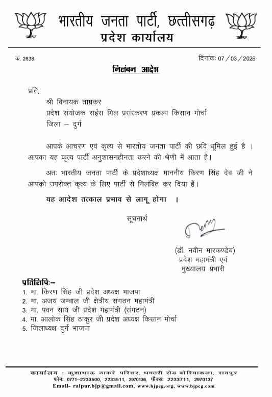 अफीम की खेती में संलिप्तता सामने आने के बाद राइस मिल प्रसंस्करण प्रकल्प किसान मोर्चा के प्रदेश संयोजक विनायक ताम्रकार को तत्काल प्रभाव से भाजपा ने निलंबित कर दिया गया है. पार्टी अध्यक्ष किरण सिंह देव के नाम से भाजपा प्रदेश महामंत्री एवं मुख्यालय प्रभारी डॉ. नवीन मारकण्डेय ने पत्र जारी कर विनायक ताम्रकार के कृत्य से पार्टी की छवि धूमिल होने की बात कहते हुए तत्काल प्रभाव से निलंबित कर दिया है.