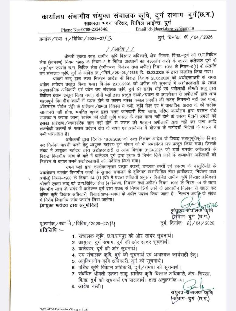 दरअसल दुर्ग जिले के ग्राम समोदा में मक्के की फसल बताकर अफीम की खेती करने वाले भाजपा नेता विनायक ताम्रकार और उसके सहयोगियों की गिरफ्तारी के बाद जिला प्रशासन ने ग्रामीण कृषि विस्तार अधिकारी एकता साहू को निलंबित कर दिया था। एकता साहू पर आरोप था कि उन्होंने खेतों में जाकर सर्वेक्षण नहीं किया, जिसके कारण कागजों में मक्के की फसल बताकर जमीन में अफीम की खेती होती रही। वहीं इस पूरे मामले में अब तक सात लोगों को जेल भेजा जा चुका है। फिलहाल एकता साहू को विकासखंड धमधा के वरिष्ठ कृषि विस्तार अधिकारी के पद पर पदस्थ किया गया है।