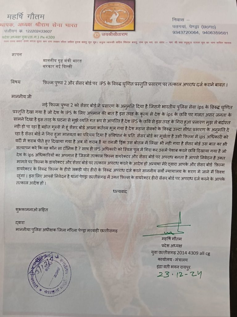बता दें कि गौरेला-पेंड्रा-मरवाही जिले के रहने वाले श्रीराम सेना के अध्यक्ष महर्षि गौतम ने गृह मंत्री को पत्र लिखकर कहा है कि फिल्म पुष्पा-2 में एक IPS अधिकारी को बहुत ही गलत तरीके से प्रस्तुत किया गया है, जो कि IPS जैसे पद की गरिमा और उनकी छवि को धूमिल कर रहा है। यही नहीं, फिल्म में IPS अधिकारी को स्विमिंग पूल में गिराकर उसमें पेशाब करने जैसे दृश्यों का इस्तेमाल किया गया है, जो कि बेहद आपत्तिजनक है।