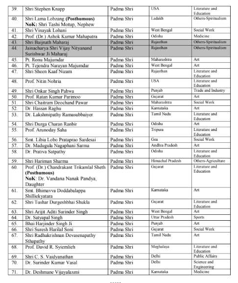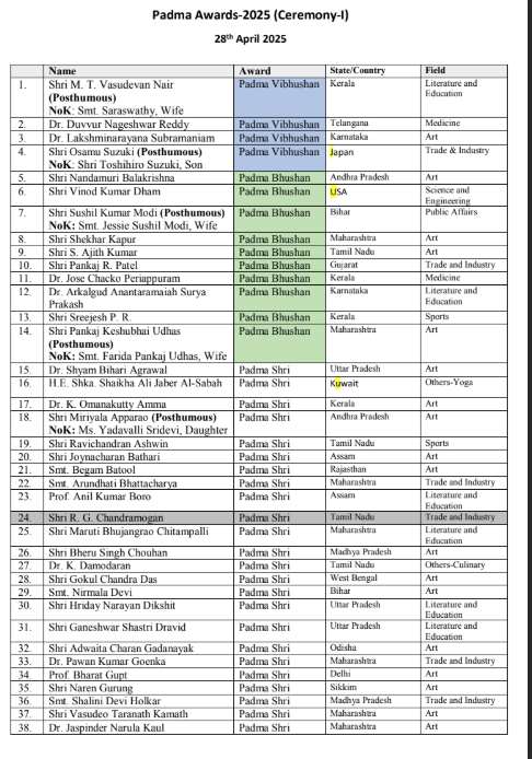 राष्ट्रपति द्रौपदी मुर्मु ने प्रसिद्ध मलयालम लेखक एम. टी. वासुदेवन नायर को फिल्म निर्देशक, पटकथा लेखक, संपादक और वक्ता, मलयालम भाषा, साहित्य और सिनेमा में उनके अद्वितीय योगदान के लिए पद्म विभूषण से सम्मानित किया. तेलंगाना के प्रख्यात गैस्ट्रोएंटेरोलॉजिस्ट डॉ. दुव्वुर नागेश्वर रेड्डी को एंडोस्कोपी में उनकी अभूतपूर्व नैदानिक प्रगति और अग्रणी चिकित्सा अनुसंधान के लिए पद्म विभूषण से सम्मानित किया गया. राष्ट्रपति द्रौपदी मुर्मु ने कला और संगीत के क्षेत्र में विशेष योगदान के लिए डॉ. लक्ष्मीनारायण सुब्रमण्यम को पद्म विभूषण से सम्मानित किया है. जापान के दिवंगत उद्योगपति ओसामु सुजुकी, जो सुजुकी मोटर कॉर्पोरेशन के पूर्व प्रमुख थे, को भारत के दूसरे सर्वोच्च नागरिक पुरस्कार, पद्म विभूषण से मरणोपरांत (व्यापार और उद्योग में) सम्मानित किया गया.