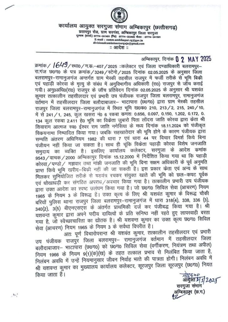 तहसीलदार यशवंत कुमार के निलंबन आदेश में उल्लेख किया गया है कि कलेक्टर एवं जिला दंडाधिकारी बलरामपुर-रामानुजगंज के निर्देश पर हुई जांच में पाया गया कि भइरा कोरवा के नाम पर संयुक्त खाते में दर्ज ग्राम भेस्की की कुल 2.411 हेक्टेयर भूमि को बिना सहखातेदार की अनुमति और सक्षम अधिकारी की पूर्व स्वीकृति के बेचा गया। यह स्पष्ट रूप से छत्तीसगढ़ शासन के वर्ष 2000 के आदेश का उल्लंघन है, जिसमें जनजातीय समुदाय की ज़मीन की खरीद-बिक्री के लिए प्रशासनिक अनुमति अनिवार्य की गई है।