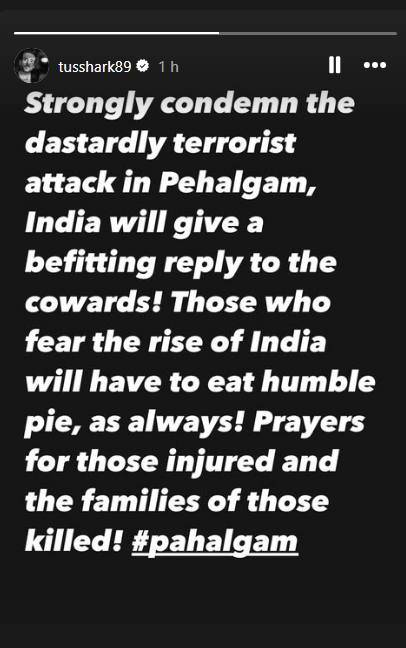 तुषार कपूर ने लिखा, ‘मैं पहलगाम में हुए क्रूर आतंकवादी हमले की कड़ी निंदा करता हूं.’ भारत कायरों को मुंहतोड़ जवाब देगा! जो लोग भारत के उत्थान से डरते हैं, वे हमेशा की तरह अपमानित होंगे! घायलों और मृतकों के परिवारों के लिए प्रार्थना! #पहलगाम’