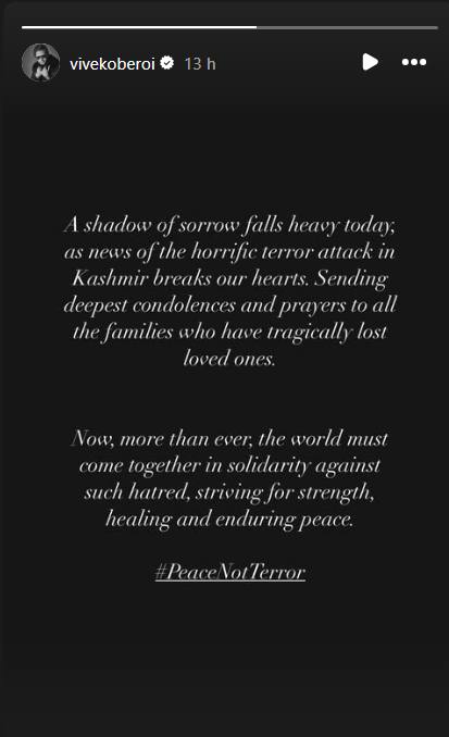 विवेक ओबेरॉय ने गहरी संवेदना व्यक्त करते हुए लिखा, ‘आज कश्मीर में हुए भीषण आतंकवादी हमले की खबर से हमारा दिल टूट गया है, इसलिए दुख की छाया भारी पड़ गई है.’ मेरी गहरी संवेदनाएं और प्रार्थनाएं उन सभी परिवारों के साथ हैं जिन्होंने अपने प्रियजनों को दुखद रूप से खो दिया है. अब, पहले से कहीं अधिक, विश्व को इस प्रकार की घृणा के विरुद्ध एकजुट होना होगा, तथा शक्ति, उपचार और स्थायी शांति के लिए प्रयास करना होगा. #शांति, आतंक नहीं’