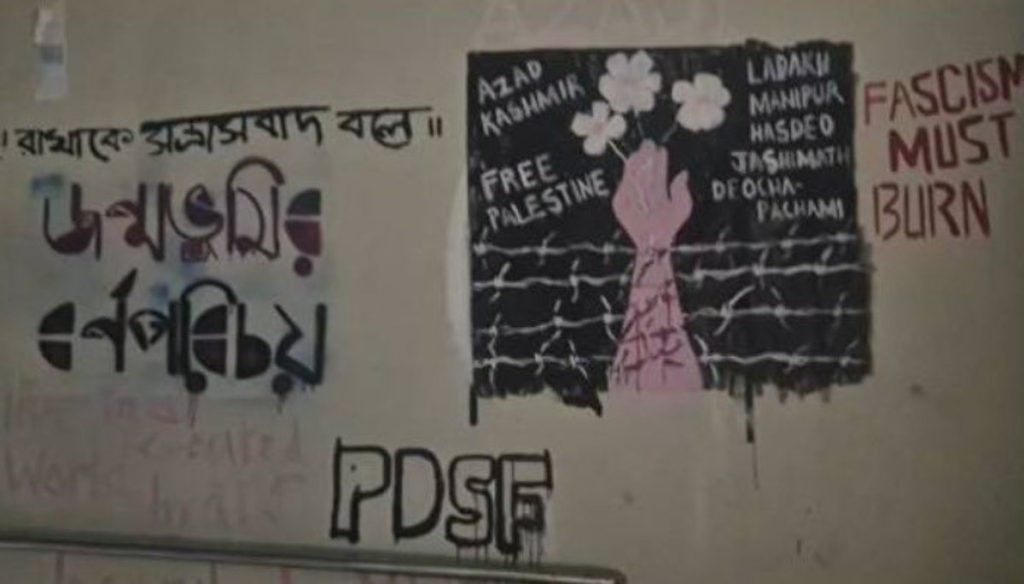 Jadavpur University Controversy: पश्चिम बंगाल (West Bengal) का जादवपुर यूनिवर्सिटी पिछले कई दिनों से विवादों में है। छात्र संघ चुनाव को लेकर छात्रों के बवाल अब एक बार फिर से यूनिवर्सिटी सुर्खियों में है। अब कोलकाता के जादवपुर यूनिवर्सिटी में दीवार पर आजाद कश्मीर (Azad Kashmir) और फ्री फिलिस्तीन (Free Palestine) की पेंटिंग (ग्रैफिटी) बनाई गई है। ये ग्रैफिटी तब बनाई गई, जब 10 मार्च को एग्जाम चल रहा था। इसे लेकर पुलिस कथित रूप से सादे कपड़ों में कैंपस में पहुंची। मामले में वामपंथी छात्र संगठन के समर्थकों पर FIR दर्ज की गई है।