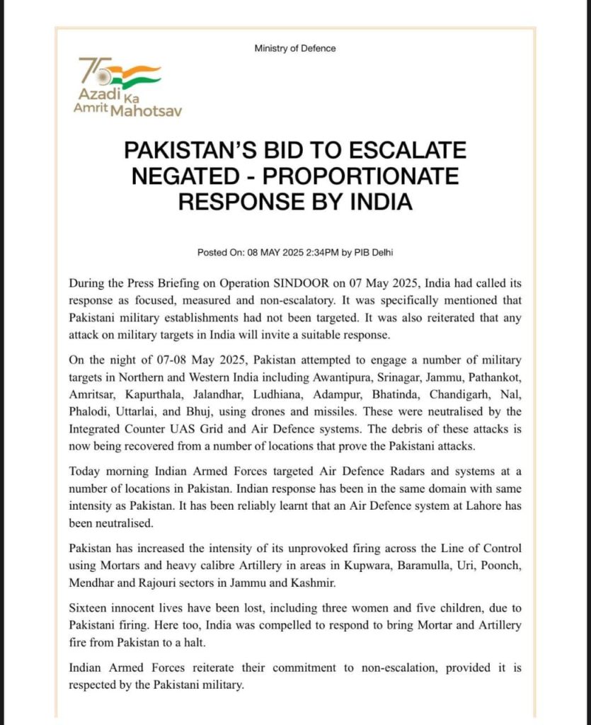 भारत सरकार ने ऑफिशियल बयान जारी करके बताया, “आज सुबह भारतीय सशस्त्र बलों ने पाकिस्तान में कई स्थानों पर एयर डिफेंस रडार और सिस्टम को निशाना बनाया। भारत ने पाकिस्तान को उसी की तरह जवाब दिया है. लाहौर में एक एयर डिफेंस सिस्टम को तबाह कर दिया गया है। PIB की प्रेस रिलीज में कहा गया है, “आज यानी 8 मई की सुबह भारतीय सशस्त्र बलों ने पाकिस्तान में कई जगहों पर एयर डिफेंस रडार और सिस्टम को निशाना बनाया। भारत ने पाकिस्तान की ही तरह उसी तीव्रता से जवाब दिया है। विश्वसनीय रूप से पता चला है कि लाहौर में एक वायु रक्षा प्रणाली को तबाह कर दिया गया है। आगे कहा गया कि पाकिस्तान ने जम्मू-कश्मीर के कुपवाड़ा, बारामुल्ला, उरी, पुंछ, मेंढर और राजौरी सेक्टरों में मोर्टार और भारी कैलिबर आर्टिलरी का उपयोग करते हुए नियंत्रण रेखा के पार गोलीबारी का दौर बढ़ा दिया है।