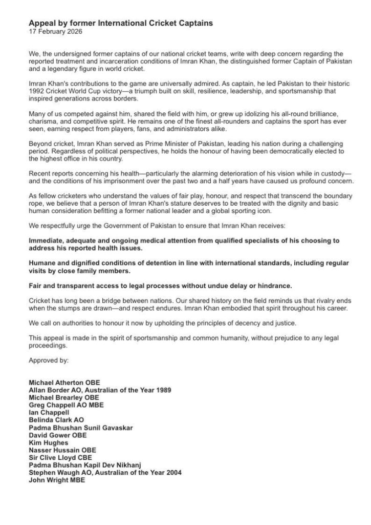 उन्होंने 1992 में पाकिस्तान को पहला और ऐतिहासिक विश्व कप खिताब दिलाया था, जो खेल भावना और नेतृत्व का प्रतीक माना जाता है। पूर्व कप्तानों ने लिखा है कि हालिया रिपोर्टों में उनकी सेहत, विशेषकर दृष्टि कमजोर होने की खबरें अत्यंत चिंताजनक हैं। उन्होंने पाकिस्तान सरकार से आग्रह किया है कि इमरान को तत्काल विशेषज्ञ डॉक्टरों से इलाज मुहैया कराया जाए और हिरासत की स्थिति मानवीय एवं गरिमापूर्ण रखी जाए।