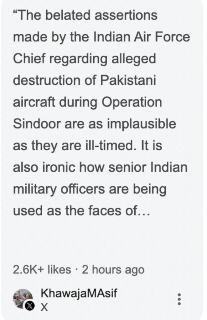 ख्वाजा आसिफ ने कहा कि ऑपरेशन सिंदूर के दौरान पाकिस्तानी विमानों को नष्ट करने के बारे में भारतीय वायुसेना प्रमुख द्वारा देर से दिए गए बयान ‘उतने ही अविश्वसनीय हैं, जितने गलत समय पर ये दिए गए हैं। आसिफ ने दावा किया कि नियंत्रण रेखा पर भारतीय सशस्त्र बलों को भी भारी नुकसान हुआ।