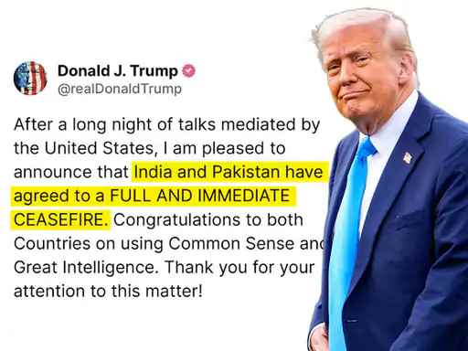 बता दें कि भारत-पाकिस्ता के बीच सीजफायर के लिए अमेरिका ने मध्यस्थता की है. शनिवार शाम 5:30 बजे यूएस राष्ट्रपति डोनाल्ड ट्रम्प ने ट्वीट कर इसकी जानकारी दी. उन्होंने बताया, ‘यूएसए की मध्यस्थता में रातभर चली लंबी बातचीत के बाद मुझे यह बताते हुए खुशी हो रही है कि भारत और पाकिस्तान तुरंत और पूरी तरह हमले रोकने के लिए तैयार हो गए हैं. मैं दोनों देशों को कॉमनसेंस, समझदारी से भरा फैसला लेने के लिए बधाई देता हूं.’