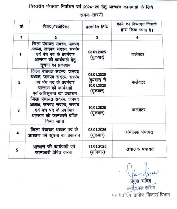 संशोधित कार्यक्रम के अनुसार, जिला पंचायत सदस्य, जनपद अध्यक्ष, जनपद सदस्य, सरपंच एवं पंच पद के प्रवर्गवार आरक्षण की कार्यवाही 3 जनवरी से शुरू होगी. 8 जनवरी को अधिसूचना का प्रकाशन किया जाएगा. 10 जनवरी को आरक्षण की जानकारी दी जाएगी.