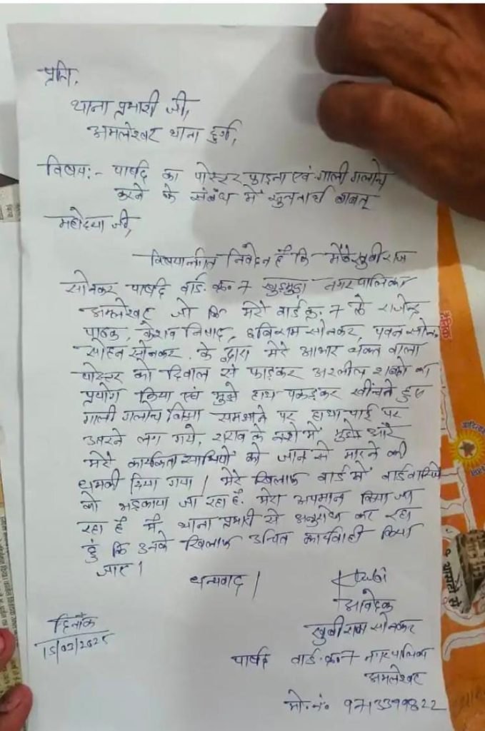 जब राजेंद्र पाठक के समर्थकों को रोका गया तो उन्होंने खूबी सोनकर और उसके समर्थकों के साथ धक्का-मुक्की करते हुए गाली-गलौच की. पार्षद खूबीराज सोनकर ने अमलेश्वर थाने में इसकी शिकायत की है. पुलिस ने मामला दर्ज कर जांच शुरू कर दी है.