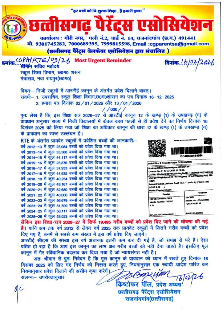 सत्यपाल राजपूत, रायपुर। छत्तीसगढ़ में शिक्षा का अधिकार कानून (RTE) के तहत निजी स्कूलों में प्रवेश लेने वाले गरीब बच्चों के भविष्य पर सवालिया निशान खड़ा हो गया है. छत्तीसगढ़ पैरेंट्स एसोसिएशन के प्रदेश अध्यक्ष क्रिष्टोफर पॉल ने राज्य सरकार पर तीखा हमला बोलते हुए आरोप लगाया है कि सरकार गरीब बच्चों से शिक्षा का हक छीन रही है. उन्होंने आरटीई कानून में किए गए बदलावों को ‘असंवैधानिक’ करार दिया है.