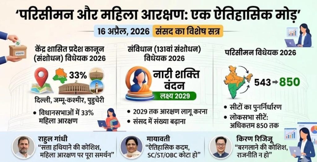 दक्षिण भारत के कई राज्यों को डर है कि जनसंख्या के आधार पर सीटों का बंटवारा होने से उनकी राष्ट्रीय स्तर पर ताकत कम हो सकती है। हालांकि, सरकार का कहना है कि सीटें घटेंगी नहीं, बल्कि सभी राज्यों की सीटें बढ़ेंगी, जिससे संतुलन बना रहेगा। फिर भी, क्षेत्रीय दल इसे अपने प्रभाव में संभावित कमी के रूप में देख रहे हैं। कुल मिलाकर, ये सिर्फ एक विधेयक नहीं, बल्कि आने वाले समय की राजनीति की दिशा तय करने वाला कदम है। असल में, ये कहानी 2023 से शुरू होती है, जब संसद ने “नारी शक्ति वंदन अधिनियम” पारित किया था। इस कानून में महिलाओं के लिए 33% आरक्षण का प्रावधान तो था, लेकिन इसे लागू करने के लिए पहले नई जनगणना और परिसीमन जरूरी बताया गया था। इसी कारण कई लोगों को लगा कि इस बदलाव को जमीन पर उतरने में काफी समय लग सकता है।