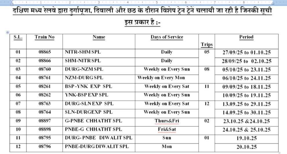 प्रतीक चौहान, रायपुर। त्योहारी सीजन को देखते हुए दक्षिण पूर्व मध्य रेलवे ने यात्रियों की सुविधा के लिए 39 विशेष ट्रेनों के संचालन की घोषणा की है। ये ट्रेनें दुर्गा पूजा, दिवाली और छठ जैसे प्रमुख त्योहारों के दौरान 21 सितंबर से 30 नवंबर 2025 तक चलाई जाएंगी। भारतीय रेल ने देशभर में त्योहारी मौसम के दौरान यात्रियों की बढ़ती मांग को पूरा करने के लिए कुल 150 पूजा स्पेशल ट्रेनों के संचालन का फैसला किया है, जो 2024 अतिरिक्त फेरे सुनिश्चित करेंगी।