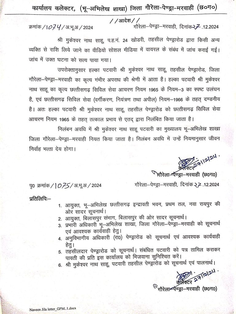 कलेक्टर कार्यालय गौरेला पेण्ड्रा मरवाही द्वारा जारी निलंबन आदेश के मुताबिक, पटवारी के खिलाफ मामले की जांच में रिश्वत लेने के आरोप सत्य पाए गए हैं, जो छत्तीसगढ़ सिविल सेवा आचरण नियम 1965 के नियम-3 का उल्लंघन है। इसके मद्देनजर पटवारी मुकेश्वर नाथ साहू को तत्काल प्रभाव से निलंबित किया गया है और उन्हें मुख्यालय भू-अभिलेख शाखा जिला गौरेला-पेण्ड्रा-मरवाही में नियत किया गया है। निलंबन अवधि में उन्हें नियमानुसार जीवन निर्वाह भत्ता दिया जाएगा।