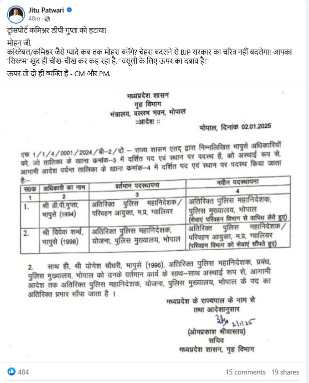 कांग्रेस प्रदेश अध्यक्ष जीतू पटवारी ने अपने सोशल मीडिया अकाउंट फेसबुक पर पोस्ट कर लिखा- ट्रांसपोर्ट कमिश्नर डीपी गुप्ता को हटाया! मोहन जी, कांस्टेबल/कमिश्नर जैसे प्यादे कब तक मोहरा बनेंगे? चेहरा बदलने से BJP सरकार का चरित्र नहीं बदलेगा! आपका ‘सिस्टम’ खुद ही चीख-चीख कर कह रहा है, “वसूली के लिए ऊपर का दबाव है!” ऊपर तो दो ही व्यक्ति हैं – CM और PM.