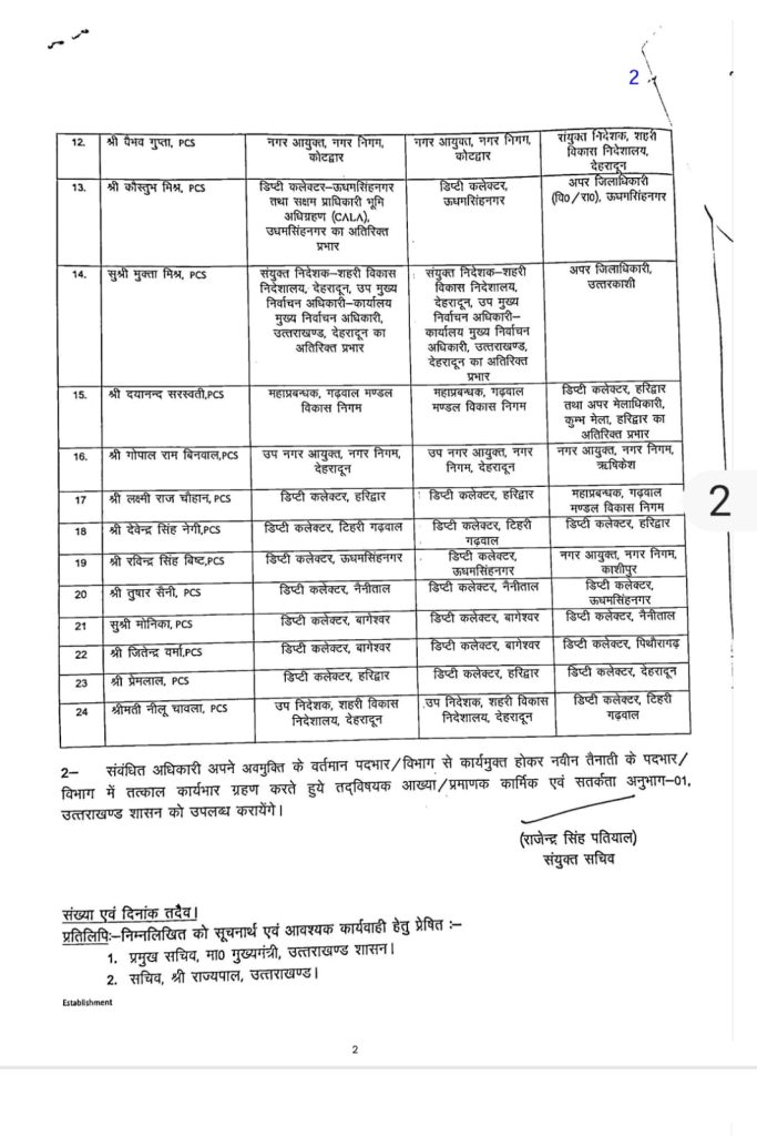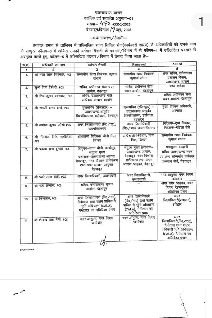 वहीं अशोक कुमार जोशी को निदेशक दुग्ध विकास और निदेशक महिला डेरी की जिम्मेदारी दी गई है। रजा अब्बास को अपर नगर आयुक्त नगर निगम देहरादून और प्रकाश चंद्र दुम्का को श्रमआयुक्त हल्द्वानी की जिम्मेदारी दी गई है। लक्ष्मीराज चौहान को महाप्रबंधक जीएमवीएन और देवेंद्र सिंह नेगी को डिप्टी कलक्टर हरिद्वार बनाया गया है।