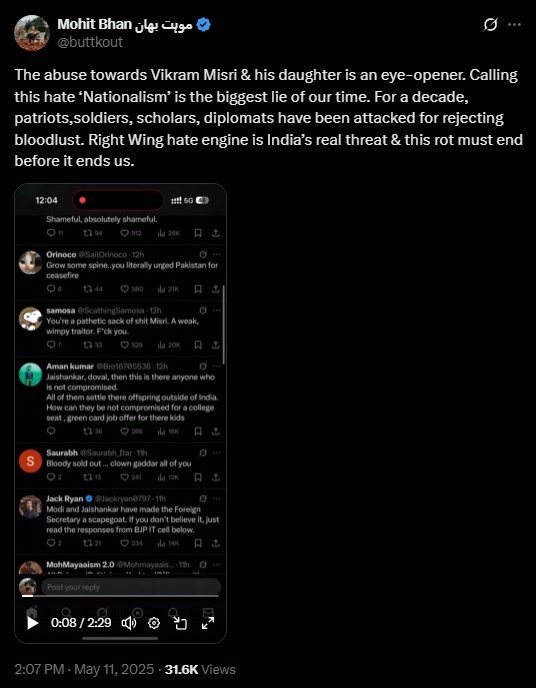 दरअसल, भारत और पाकिस्तान के बीच 3 दिनों तक चले जंग के बाद कल (शनिवार) युद्ध विराम लग गया था। विदेश सचिव विक्रम मिसरी ने इसकी जानकारी दी। जिसके कुछ देर बाद ही उनके खिलाफ हेट कमेंट्स आने शुरू हो गए। उन्होंने अपने परिवार के साथ एक तस्वीर शेयर की थी जिसमें उनके साथ उनकी बेटी भी थी। लोगों ने उसे भी निशाने में ले लिया और अपमानजनक बातें लिखने लगे।