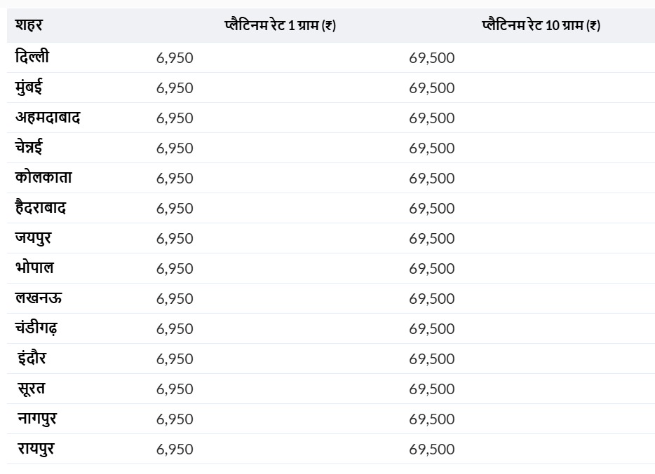 यानी, 10 ग्राम प्लैटिनम की कीमत ₹69,500 है. देश भर के ज़्यादातर शहरों में प्लैटिनम की कीमतें लगभग एक जैसी रहीं. मुंबई, चेन्नई, अहमदाबाद, कोलकाता, जयपुर, भोपाल और इंदौर में 1 ग्राम प्लैटिनम की कीमत ₹6,680 है.