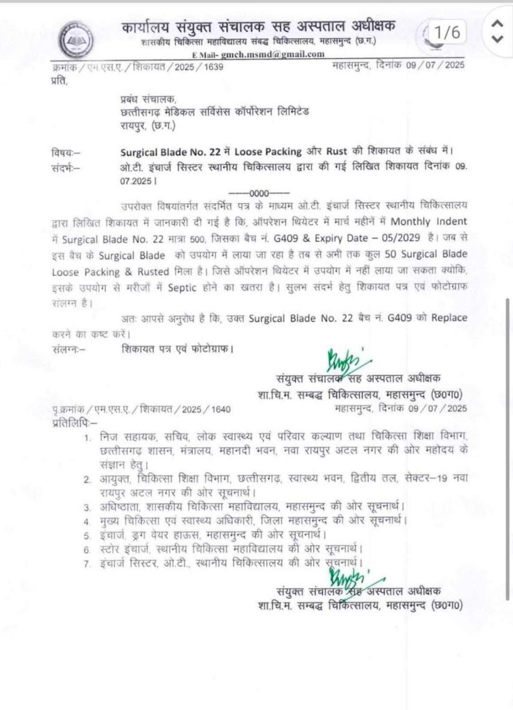 सह अस्पताल अधीक्षक महासमुंद ने सीजीएमएसी को लिखे शिकायत पत्र में लिखा है कि ओटी इंचार्ज, सिस्टर, स्थानीय चिकित्सालय ने लिखित शिकायत में जानकारी दी है कि ऑपरेशन थियेटर में मार्च महीनें में Monthly Indent में Surgical Blade No. 22 मात्रा 500, जिसका बैच नं. G409 & Expiry Date 05/2029 है जब से इस बैच के Surgical Blade को उपयोग में लाया जा रहा है तब से अभी तक कुल 50 Surgical Blade Loose Packing & Rusted मिला है. इसे ऑपरेशन थियेटर में उपयोग में नहीं लाया जा सकता, क्योंकि इसके उपयोग से मरीजों में Septic होने का खतरा है. आपसे अनुरोध है कि उक्त Surgical Blade No. 22 बैच नं. G409 को रिप्लेस करने का कष्ट करें.