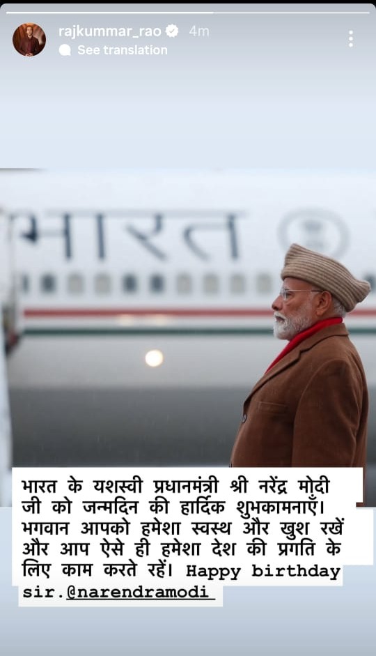 एक्टर राजकुमार राव ने भी प्रधानमंत्री नरेंद्र मोदी को जन्मदिन की बधाई देते हुए अपने इंस्टाग्राम की स्टोरी पर उनकी फोटो शेयर करते हुए लिखा- “भारत के यशस्वी प्रधानमंत्री नरेंद्र मोदी जी को जन्मदिन की हार्दिक शुभकामनाएँ. भगवान आपको हमेशा स्वस्थ और खुश रखें और आप ऐसे ही हमेशा देश की प्रगति के लिए काम करते रहें। Happy birthday sir. @narendramodi.”
