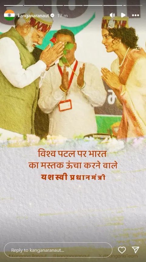 वहीं, एक्ट्रेस और सांसद कंगना रनौत (Kangana Ranaut) ने भी अपनो इंस्टाग्राम की स्टोरी पर पीएम मोदी के साथ अपनी एक फोटो शेयर करते हुए लिखा- “विश्व पटल पर भारत का मस्तक ऊंचा करने वाले यशस्वी प्रधानमंत्री.”