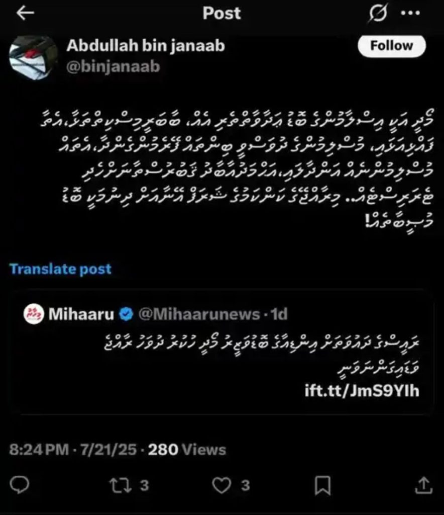 अब्दुल्लाह ने अपने पोस्ट में लिखा था- मोदी इस्लाम के सबसे बड़े दुश्मन हैं। वह एक आतंकवादी हैं। उन्होंने बाबरी मस्जिद गिराई है, पुरानी मुस्लिम जमीनों को लूटा और अहमदाबाद को कब्रिस्तान में बदल दिया। मालदीव का उन्हें बुलाना बड़ी गलती है। अब्दुल्लाह मालदीव के राष्ट्रपति मोहम्मद मुइज्जू की पत्नी साजिदा मोहम्मद की ओर से बनाए गए एक संगठन से जुड़े हैं।