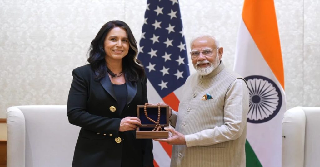 प्रधानमंत्री नरेंद्र मोदी से सोमवार को अमेरिका की राष्ट्रीय खुफिया सुरक्षा की निदेशक तुलसी गबार्ड ने मुलाकात की. इस दौरान दोनों के बीच भारत-अमेरिका व्यापक वैश्विक रणनीतिक साझेदारी को आगे बढ़ाने पर विचारों का आदान-प्रदान हुआ. पीएम ने कहा कि दोनों देश आतंकवाद का मुकाबला करने और समुद्री और साइबर सुरक्षा सहयोग बढ़ाने के लिए प्रतिबद्ध हैं. इस दौरान पीएम मोदी ने उन्हें महाकुंभ का पवित्र जल भेंट किया. वहीं गबार्ड ने पीएम को तुलसी की माला भेंट की.