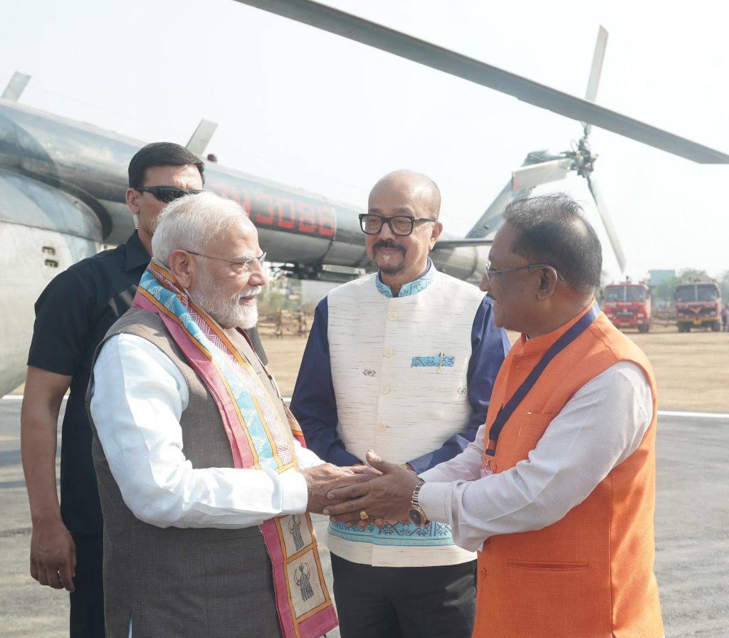 पीएम मोदी का स्वागत करते हुए छत्तीसगढ़ के मुख्यमंत्री विष्णुदेव साय