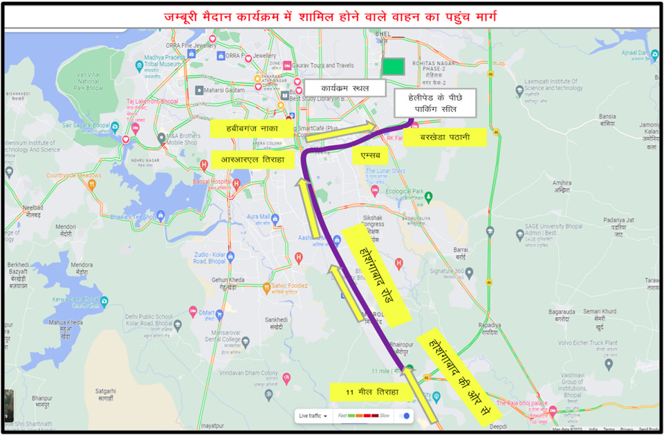- भोपाल से आने वाले सभी प्रकार के बस वाहन प्रभात चौराहा, आईटीआई तिराहा, पिपलानी पेट्रोल पंप तिराहा होते हुए एनसीसी ग्राउंड और भेल दशहरा मैदान में बस पार्किग स्थल पर पार्क करेंगे।