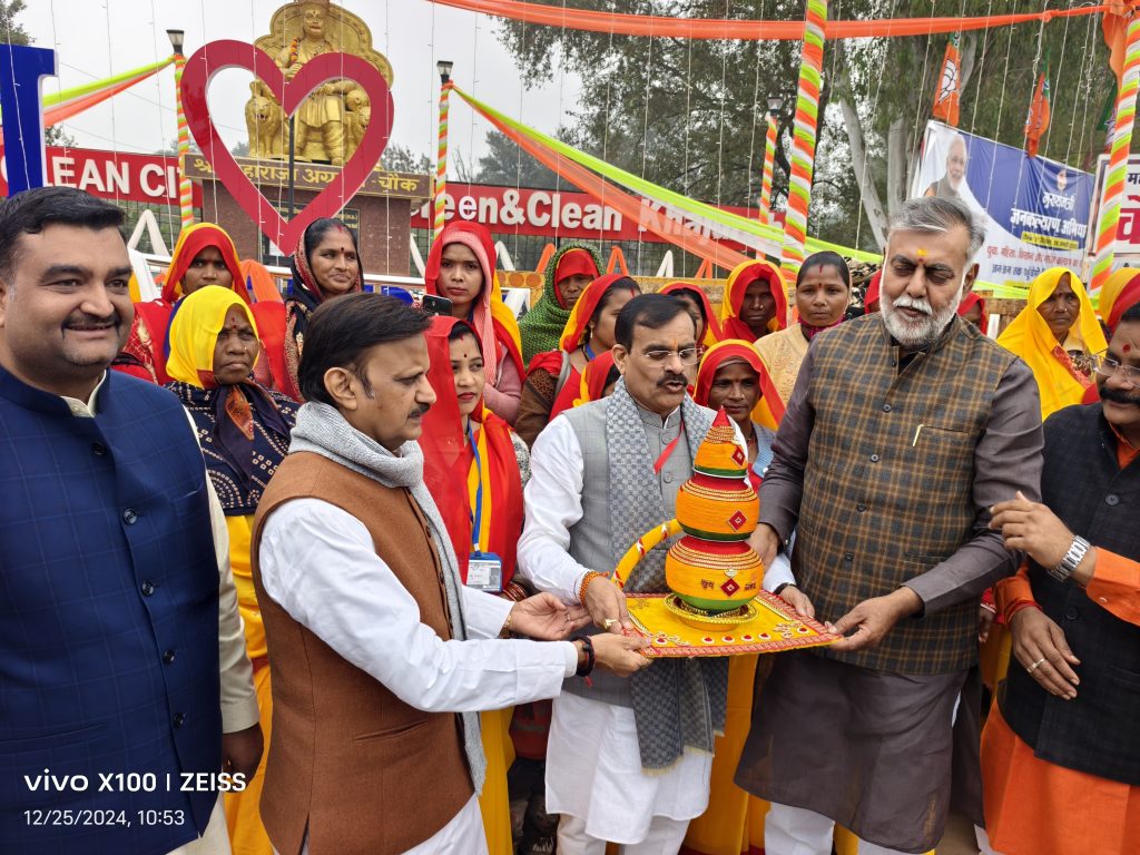 भूमिपूजन से पहले केन-बेतवा नदी के पवित्र जल की कलश यात्रा निकाली गई। खजुराहो सांसद और बीजेपी प्रदेश अध्यक्ष वीडी शर्मा खुद कलश लेकर निकले। इस दौरान सैंकड़ों की संख्या में महिलाएं शामिल हुईं। डिप्टी सीएम राजेंद्र शुक्ल और कैबिनेट मंत्री प्रह्लाद पटेल भी इसमें शामिल हुए। वीडी शर्मा ने इस दौरान नरेन्द्र मोदी आए हैं, बुंदेलखंड में खुशहाली लाए हैं के नारे लगाए।