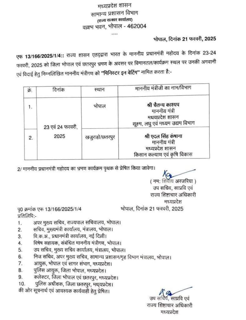 भोपाल में एमएसएमई पर मिनिस्टर चैतन्य काश्यप पीएम मोदी का स्वागत करेंगे। एयरपोर्ट पर प्रधानमंत्री के लिए सरकार ने उन्हें यह जिम्मेदारी दी है। वहीं खजुराहो छतरपुर में कृषि मंत्री इंदल सिंह कंसाना को प्रधानमंत्री के स्वागत की जिम्मेदारी दी गई है। सामान्य प्रशासन विभाग ने मंत्रियों की जिम्मेदारी को लेकर आदेश जारी कर दिया है।