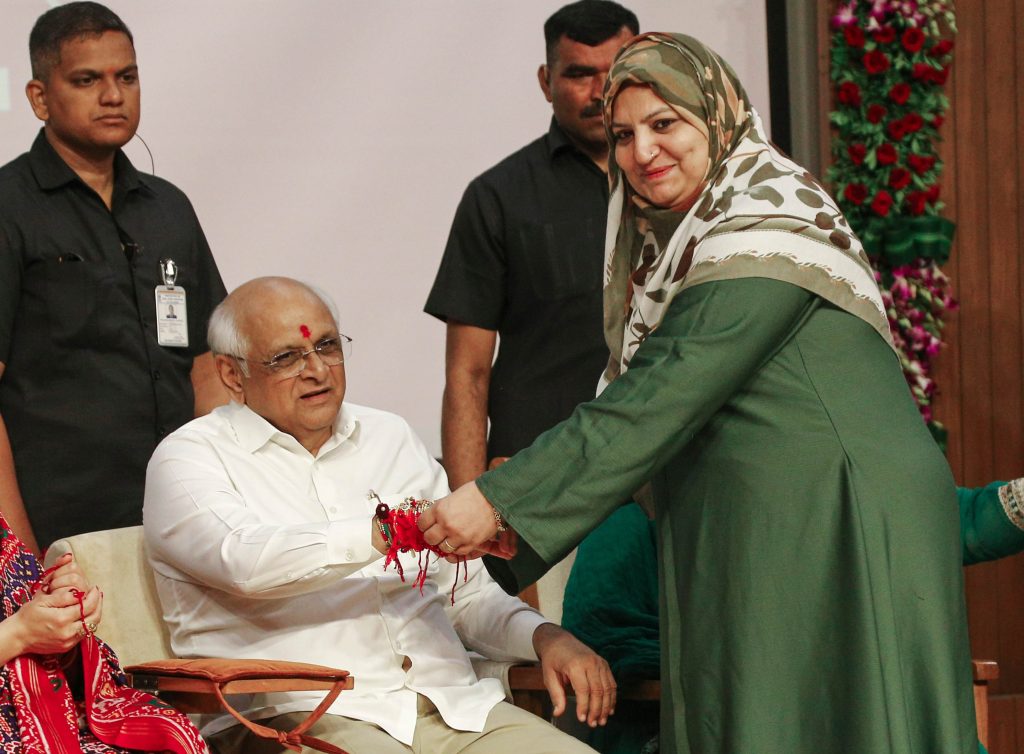 गुजरात के गांधीनगर में शनिवार रक्षा बंधन उत्सव के दौरान गुजरात के सीएम भूपेंद्र पटेल को भी कई महिलाओं ने राखी बांधकर यह त्यौहार मनाया। तस्वीर में एक मुस्लिम महिला गुजरात के मुख्यमंत्री भूपेन्द्र पटेल को राखी बांधती दिखाई दे रही हैं।
